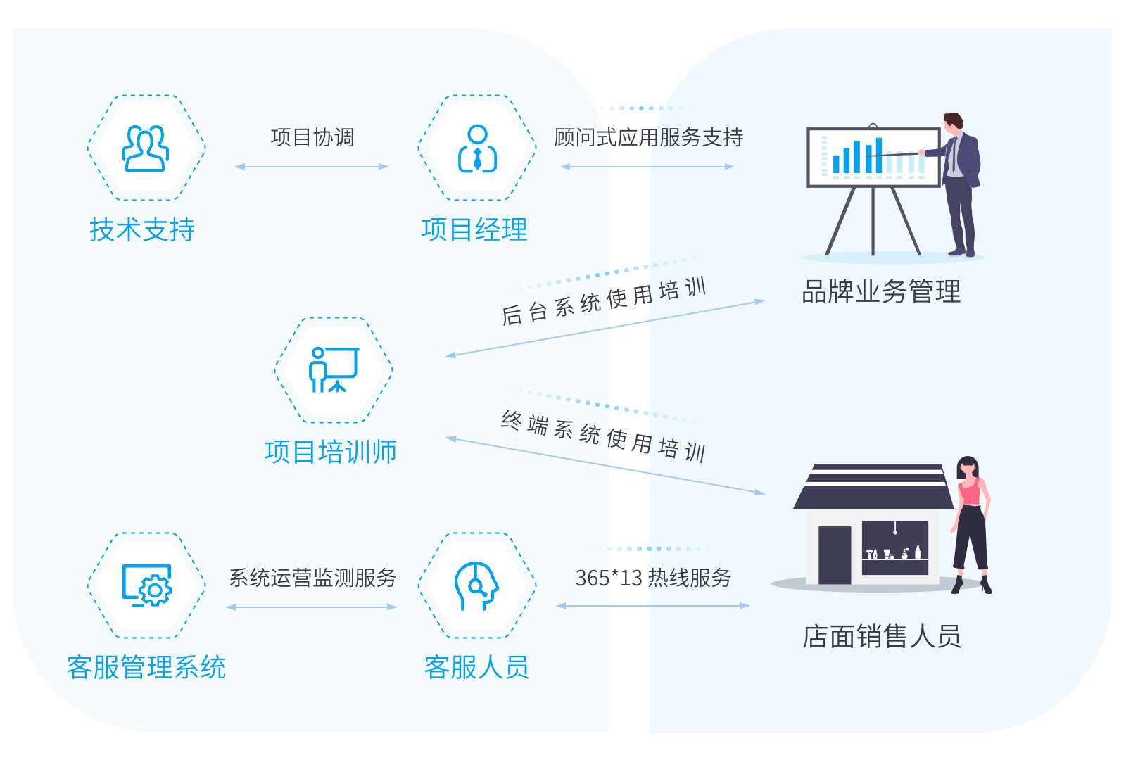 系統化的技術支持、業務培訓、系統運維、代運代管服務,將助力品牌以更高的質量、更快速的響應和更低的成本投入,開展品牌零售數字化。